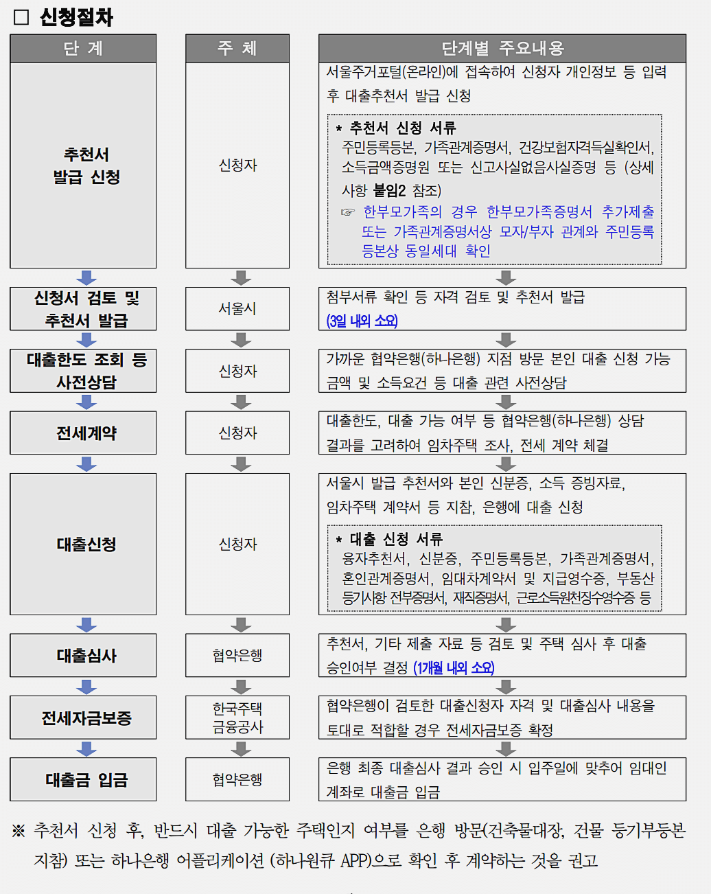 - 추천서 발급 신청: 서울주거포털(http://housing.seoul.go.kr)에서 온라인 신청
