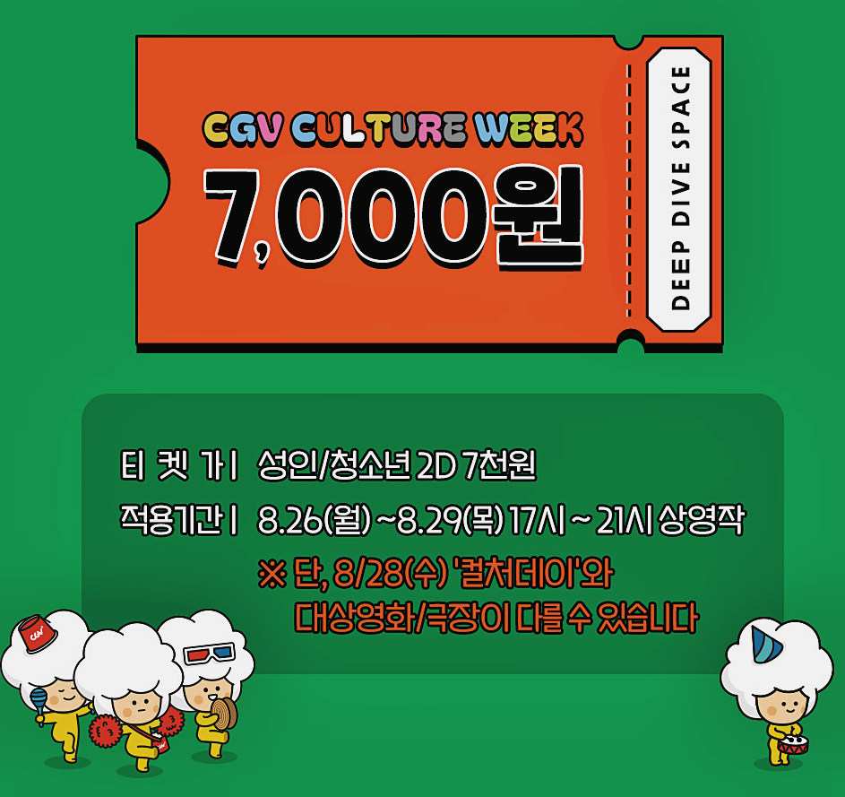 - 할인 가격 : 성인/청소년 2D 영화 7천 원